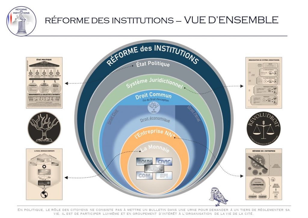 Toutefois, au-delà des travaux déjà entrepris, il reste beaucoup à faire, en particulier à dépoussiérer le droit actuel de ses scories amassés par les velléités commercialistes de règlementation tout azimut. A cette fin, j’ai donc pris l’initiative de créer un Cercle de Réflexion du droit appelé « RévoluDroit », dont la finalité est de développer une École de Droit alternatif dont les fondamentaux suivront l’ordre naturel, et iront en conséquence dans le sens du droit naturel, concept devant lui-même être rénové. Vous trouverez l’essentiel des informations dans la page « RévoluDroit » de mon site.