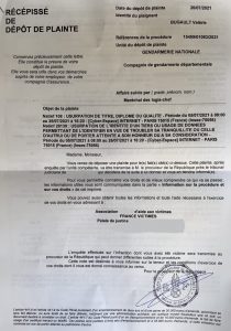 Voici le récépissé de la plainte déposée le 26 juillet dernier pour usurpation d’identité contre le ou les individus ayant créés cette page Facebook en utilisant des photos de moi.